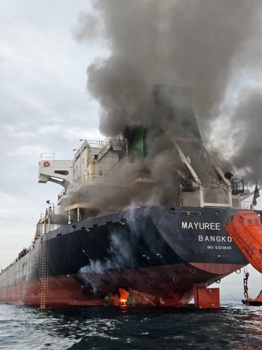 Thai ship Mayuree Naree burns after an Iranian USV strike in the Strait of Hormuz on March 11 (Pictures: EPN/Newscom / Avalon)